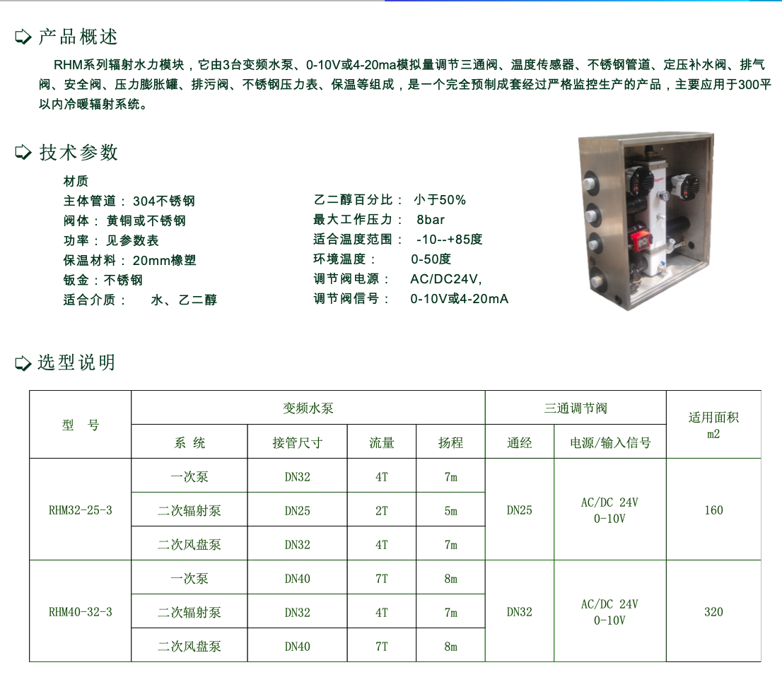 RHM系列辐射水力模块,它由3台变频水泵、0-10V或4-20ma模拟量调节三通阀、温度传感器、不锈钢管道、定压补水阀、排气 阀、安全阀、压力膨胀罐、排污阀、不锈钢压力表、保温等组成,是一个完全预制成套经过严格监控生产的产品,主要应用于300平 以内冷暖辐射系统。